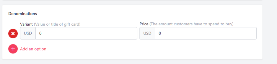 Next part, in Denomination, you can type Value of gift card in Variant and the Price of Gift card.