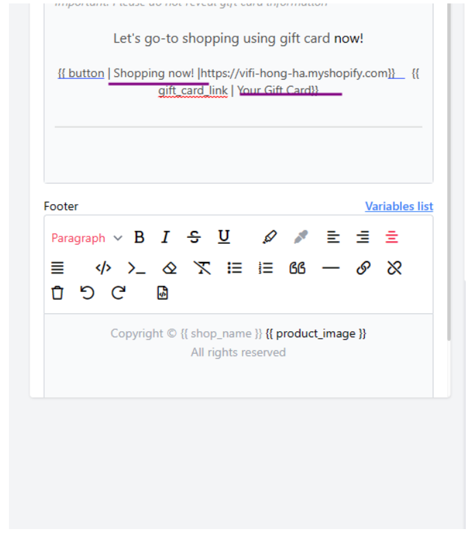 - Body: You can change the title of Shopping Now! button and Your Gift card button by customize the underline text on below photo.