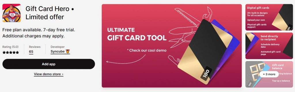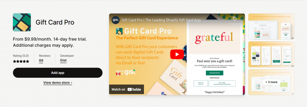 Gift Card Pro is a Shopify app that allows store owners to create and sell digital gift cards on their Shopify store. The app provides a range of features, including the ability to schedule to send Gift Cards via Email or text message; pre-set / custom gift card values. adding specific Gift Card values to choose from and personalized gift cards with gift messages or recorded videos messages!. Especiall, Gift Card Pro has just release new feature which allow merchant to send up to 1,000 different email recipients in one order. With Gift Card Pro, you can choose the options your customers see, and build a unique experience. Overall, Gift Card Pro is a valuable tool for Shopify store owners looking to sell and manage digital gift cards on their store.