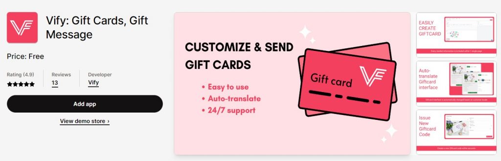 Vify Gift Card App is a Shopify app that enables store owners to create customizable digital gift cards that customers can use to make purchases on their Shopify store. Vify Gift Card App provides a range of features, including the ability to set the gift card value, customize the design and appearance of the gift card, and track gift card sales and redemptions. The app also offers various customization options, such as the ability to add images, logos, and personalized messages to the gift card. Vify Gift Card App can help Shopify store owners to boost revenue, increase customer loyalty, and streamline the process of selling and managing digital gift cards on their store.