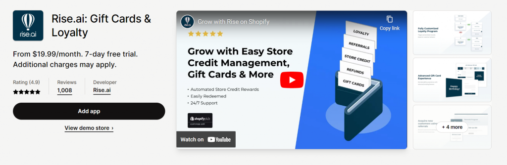 Rise.ai is an advanced platform for eCommerce brands that provides a range of solutions for managing gift cards, store credit, rewards, referrals, refunds, and loyalty programs. By using these features, businesses can improve customer retention rates and increase customer lifetime value. Instead of using points, Rise.ai allows businesses to reward customers with easily understandable dollar amounts in the form of store credit incentives. The platform also integrates with Shopify POS and provides an omnichannel solution for rewarding customers across different shopping channels. With Rise.ai, businesses can send, schedule, and remind customers about gift cards, trigger store credit rewards based on customer actions, issue gift card refunds, offer store credit for returns, launch proactive loyalty programs, and manage bulk gift cards for corporate gifts, employee recognition, or migration purposes.