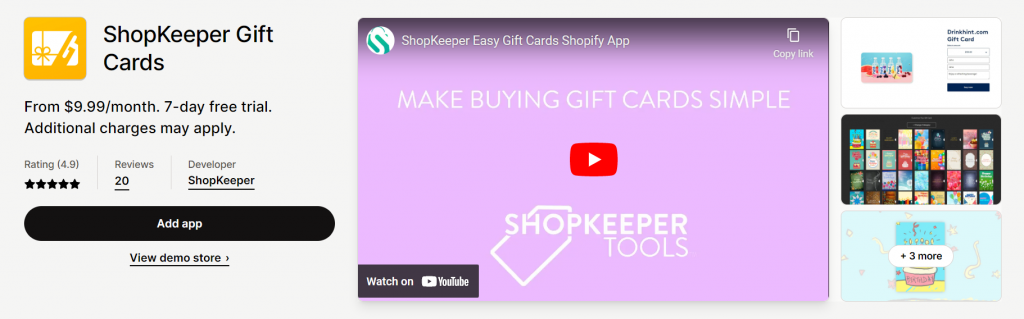 ShopKeeper Gift Cards app provides an effortless way to add personalized and customizable gift cards to your store with more than 650 design options. The app replaces the default Shopify gift card designs and allows your customers to send personalized gift cards for any occasion directly from the gift card product page. You can easily integrate the app into your Shopify store with the help of the app team. Additionally, you can create a custom design that matches your branding by choosing the Branded Plan. By ditching the plain default Shopify gift card, you can add appeal to your store and boost sales.