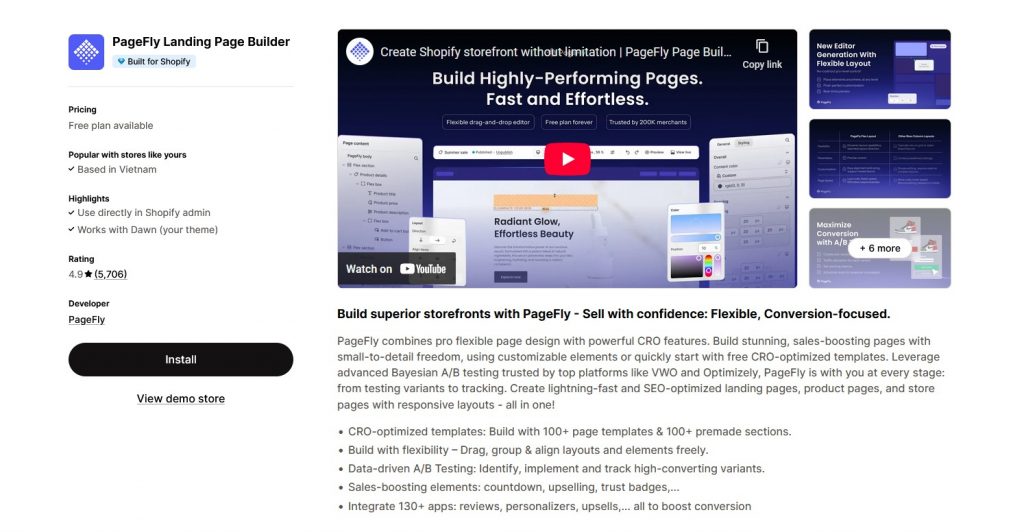 | PageFly Landing Page Builder | Conversion-focused page builder, A/B testing, 130+ app integrations | SEO, conversions, responsive landing/product pages | Free to $99/month |