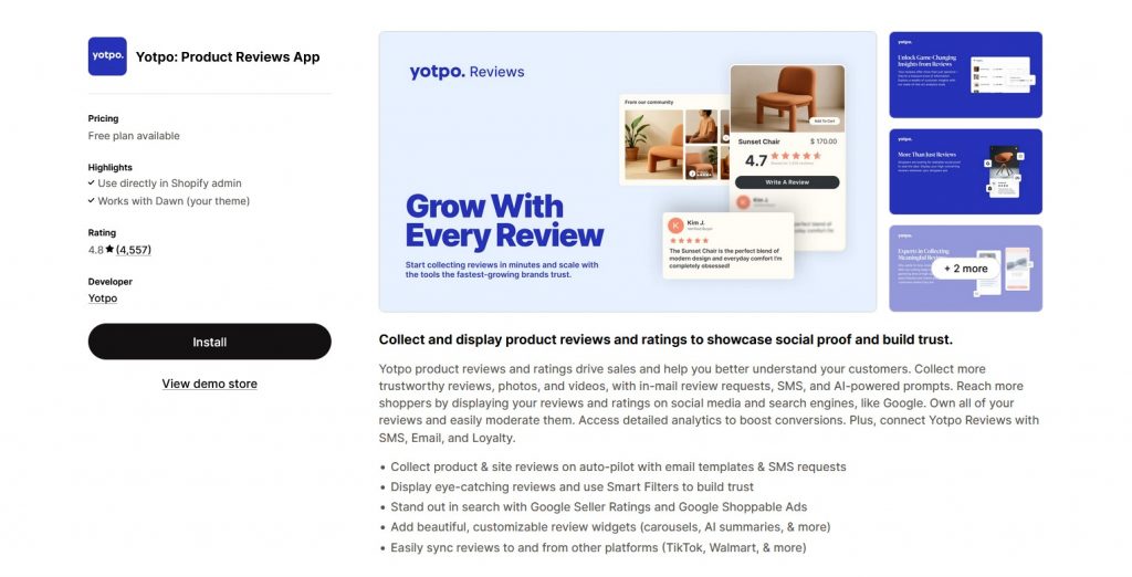 | Yotpo: Product Reviews App | Automated review collection, Google Seller Ratings, customizable widgets | Building trust, SEO, cross-platform review syncing | Free to $119/month |
