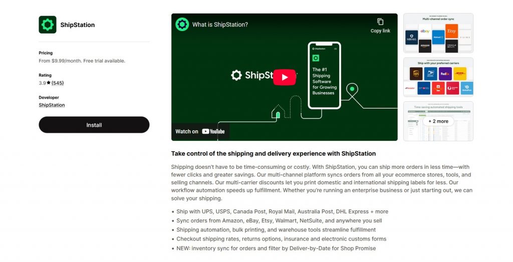 | ShipStation | Multi-channel order syncing, discounted shipping, and automation | High-volume orders, international shipping, multi-channel sales | Free to $399.99/month |